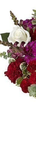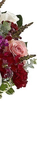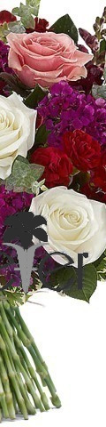 4 x Pink Roses, 4 x White Roses, Red Spray Carnations, Purple Bouvardia, Eucalyptus